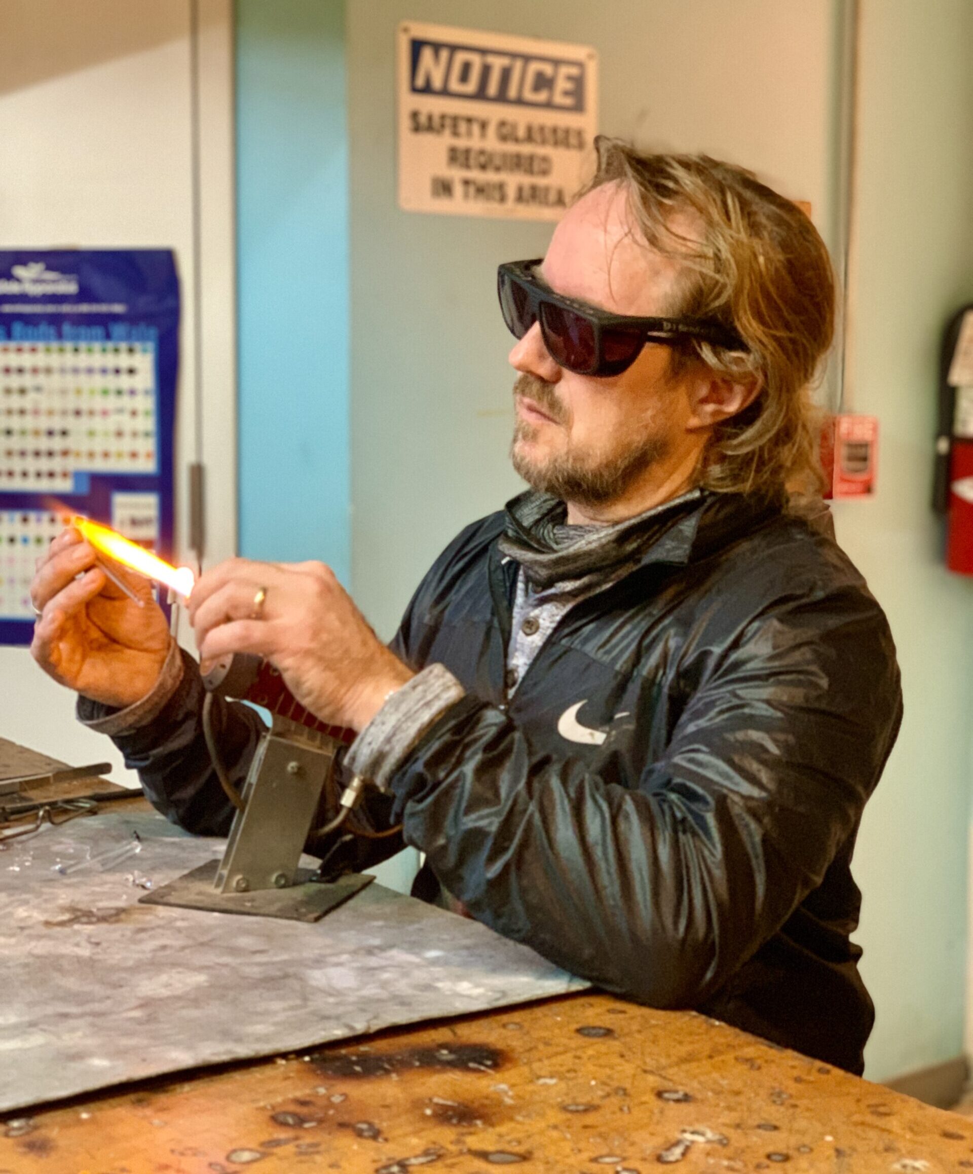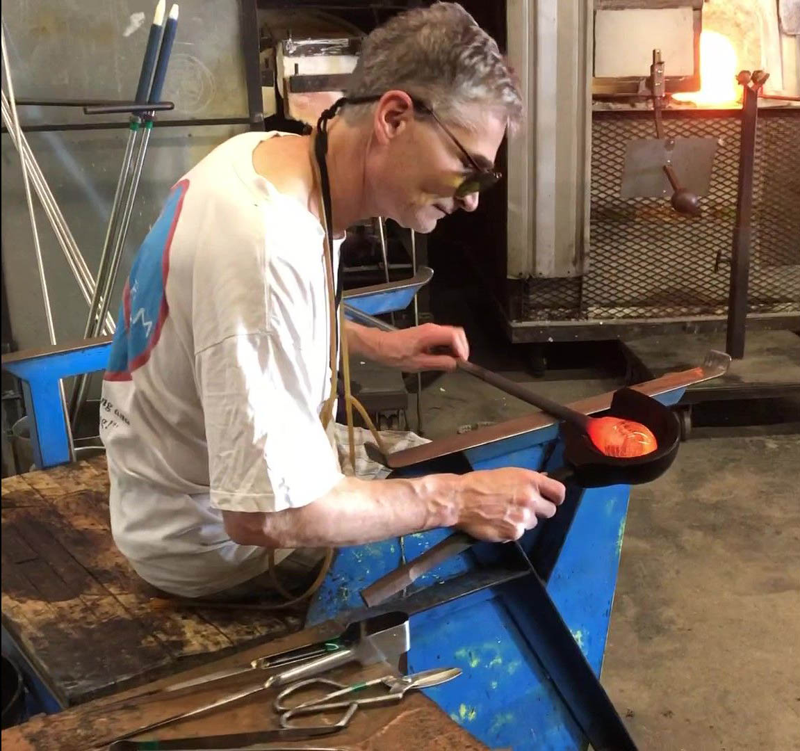 Ken came to glassblowing in a rather unusual manner. Years ago he took his wife to a Paperweight and Wine date right here at Diablo and never left. As a professional French Horn player he approaches glassblowing with a ‘lyrical’ attitude and likes to push the limits on how things ‘should’ be done. His glassblowing partner will tell you that you should never tell Ken: “It’s not possible to make it that way” because he will just dig in his heels and either find a fabulous new method, or fail miserably. Either way – it’s a passionate addiction.